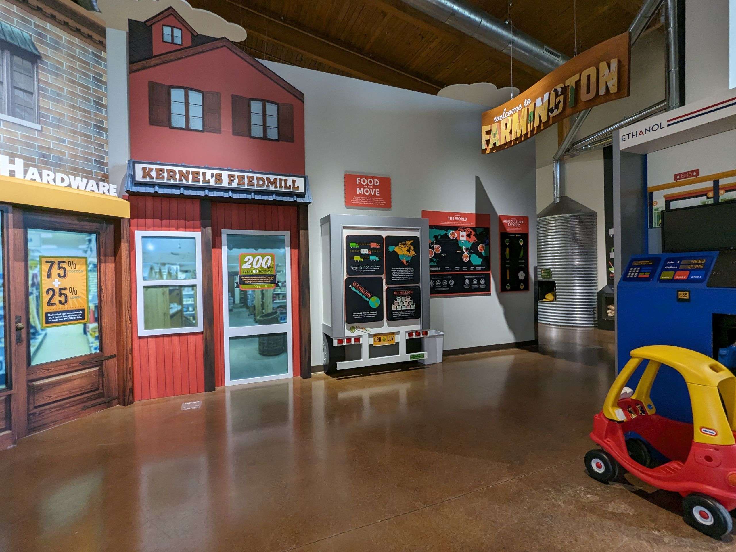 Inside the Crop Adventure Building, visitors learn about the different types of crops, how they are planted, harvested, and processed, the underground world, fuel alternatives, and the future of farming. The Crop Adventure is geared for all ages. There is a scavenger hunt to learn about crop farming and Farmington, a kid’s play area, a National Geographic movie about the future of agriculture, and educational games.