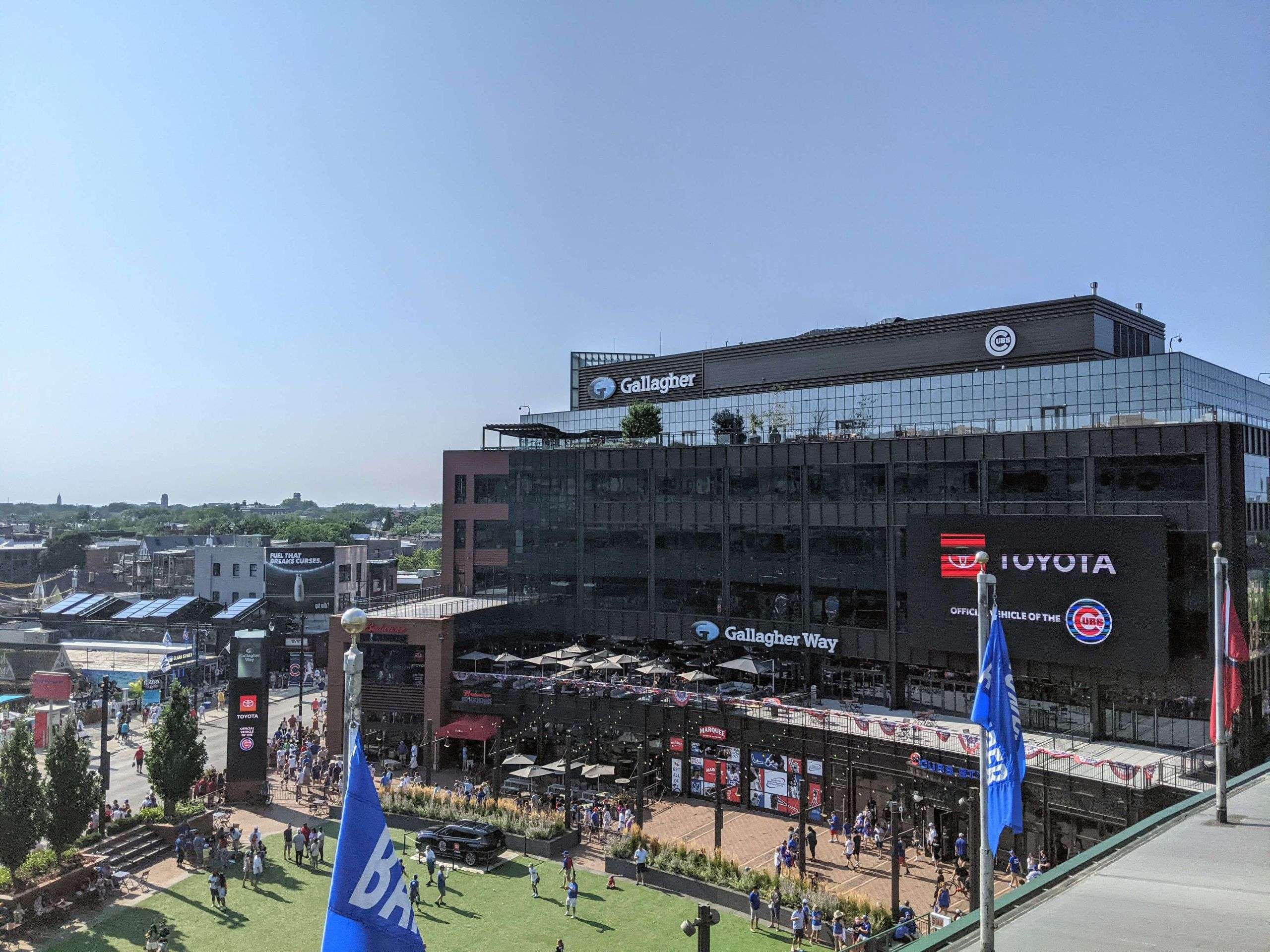 Just outside the Wrigley Field, lies Gallagher Way – a free field and park. It offers various activities for visitors, featuring free events, park movies, live music, and interactive water fountains. These entertainment options are available on game and non-game days.