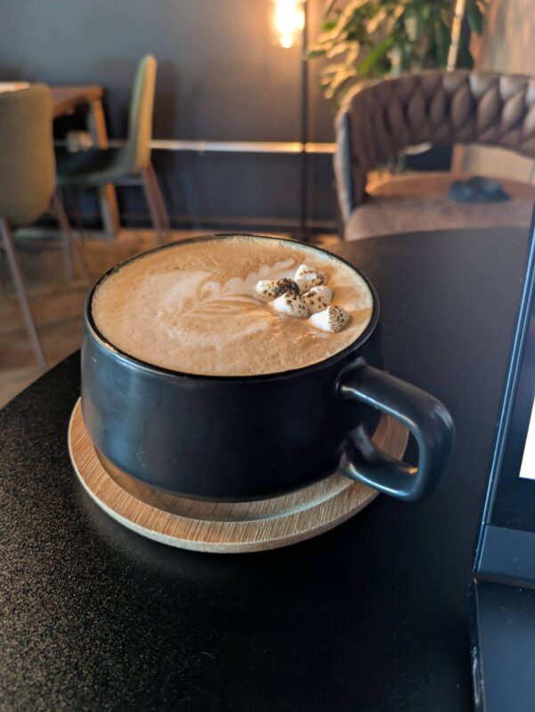 Coffee shop with a German flair, cozy and approachable.